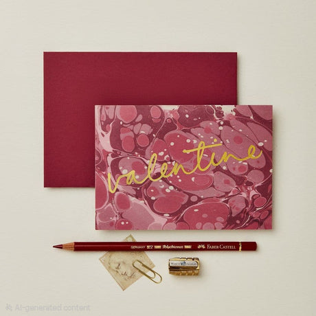 A deep scarlet Valentines Day card ina marble pattern, paired with a matching red envelope